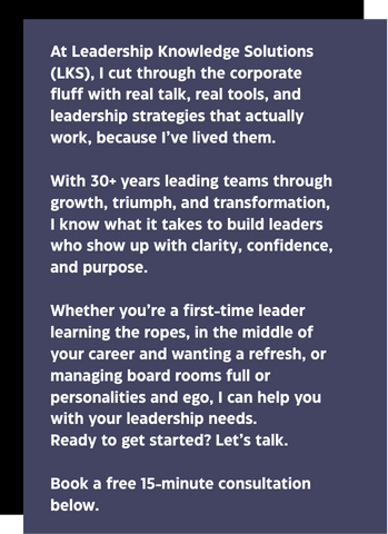 My coaching is all about building clarity, confidence, sharpening your skills, and helping you lead in a way that feels genuinely you. Fun, focused, and full of lightbulb moments.