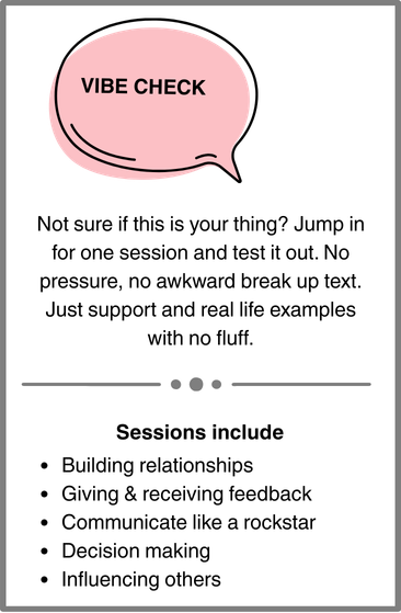 A: That’s why there’s the Vibe Check, one session, no strings. Try it out. If you love it, I’ll see you again. If not, no awkward unsubscribe guilt required.